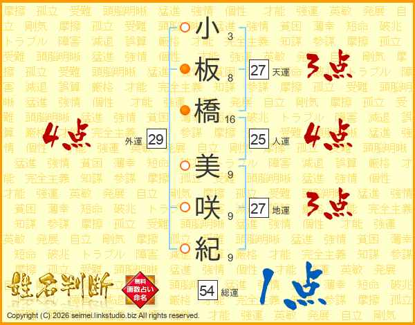 小(3画)板(8画)橋(16画) 美(9画)咲(9画)紀(9画)