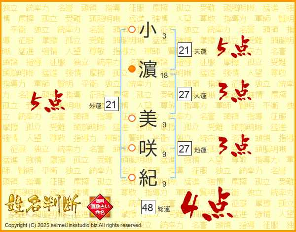 小(3画)濵(18画) 美(9画)咲(9画)紀(9画)