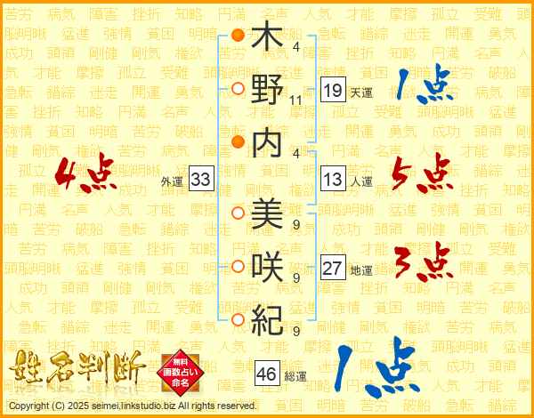 木(4画)野(11画)内(4画) 美(9画)咲(9画)紀(9画)