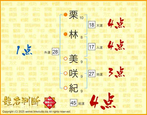 栗(10画)林(8画) 美(9画)咲(9画)紀(9画)