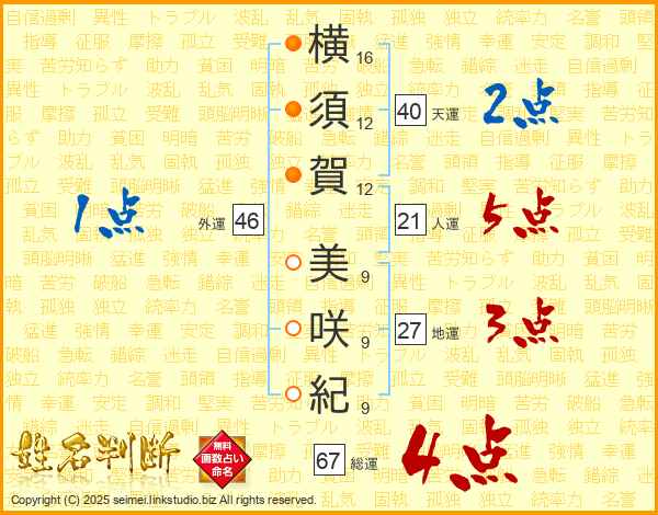 横(16画)須(12画)賀(12画) 美(9画)咲(9画)紀(9画)