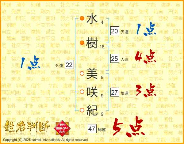 水(4画)樹(16画) 美(9画)咲(9画)紀(9画)