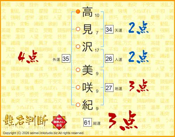 高(10画)見(7画)沢(17画) 美(9画)咲(9画)紀(9画)