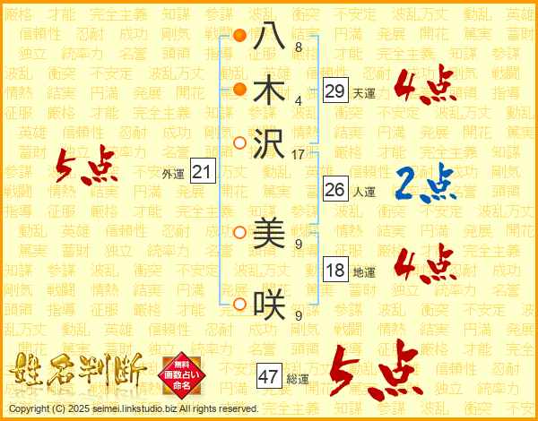 八(8画)木(4画)沢(17画) 美(9画)咲(9画)