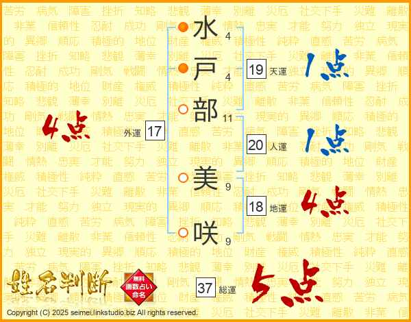 水(4画)戸(4画)部(11画) 美(9画)咲(9画)