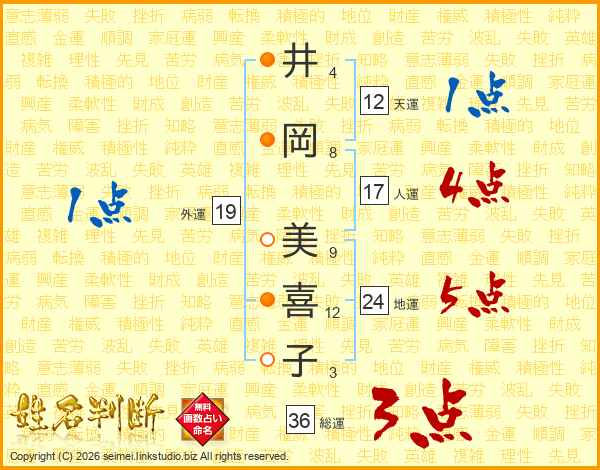井(4画)岡(8画) 美(9画)喜(12画)子(3画)