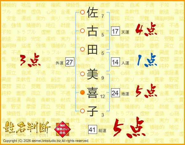 佐(7画)古(5画)田(5画) 美(9画)喜(12画)子(3画)