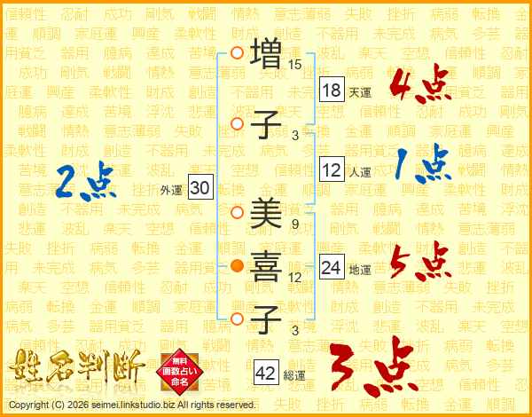 増(15画)子(3画) 美(9画)喜(12画)子(3画)