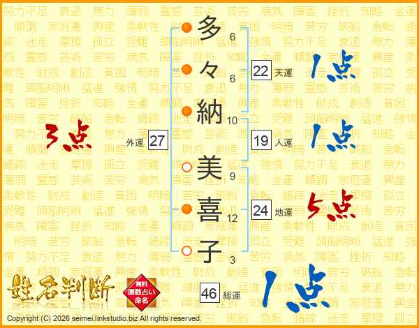 多々納美喜子さんの総運は46画の1点!