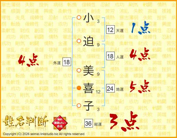 小(3画)迫(9画) 美(9画)喜(12画)子(3画)