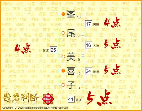 峯(10画)尾(7画) 美(9画)喜(12画)子(3画)