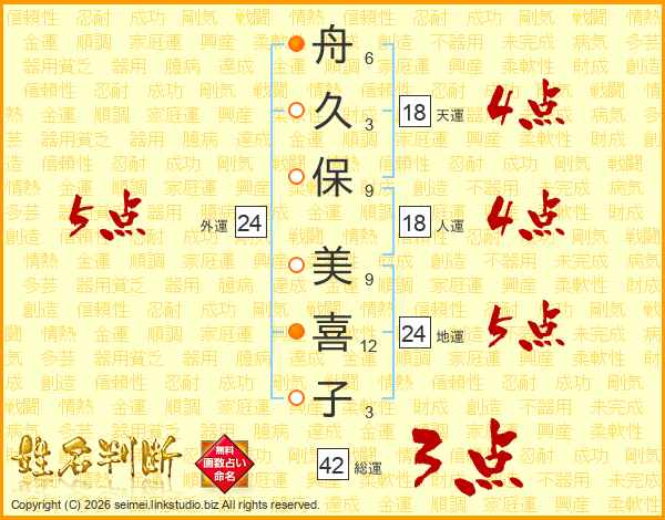 舟(6画)久(3画)保(9画) 美(9画)喜(12画)子(3画)