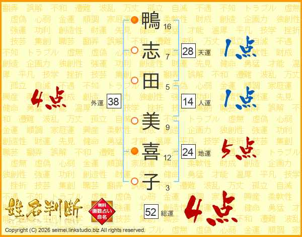 鴨(16画)志(7画)田(5画) 美(9画)喜(12画)子(3画)