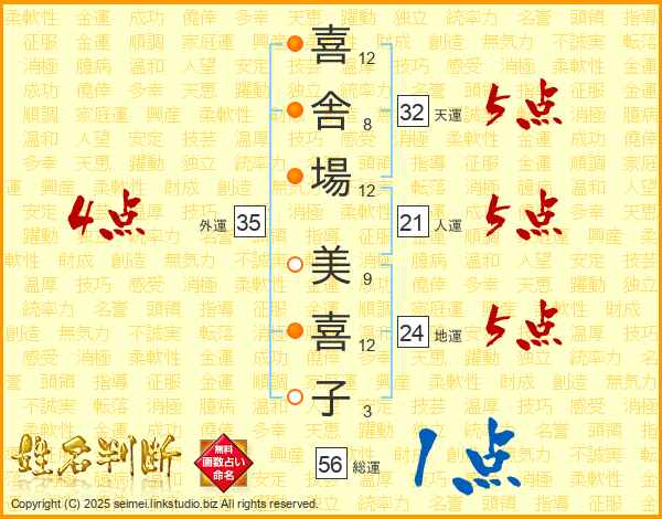 喜(12画)舎(8画)場(12画) 美(9画)喜(12画)子(3画)