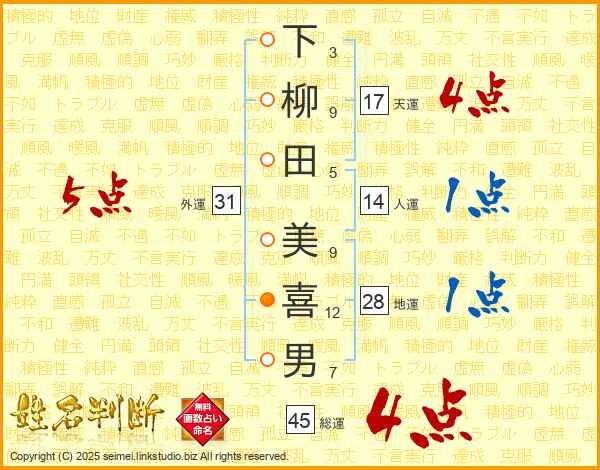 下(3画)柳(9画)田(5画) 美(9画)喜(12画)男(7画)