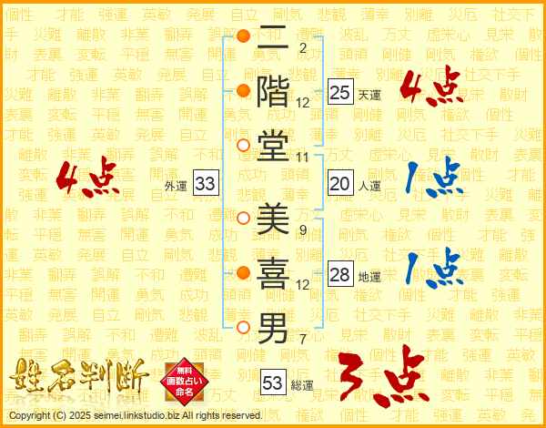 二(2画)階(12画)堂(11画) 美(9画)喜(12画)男(7画)