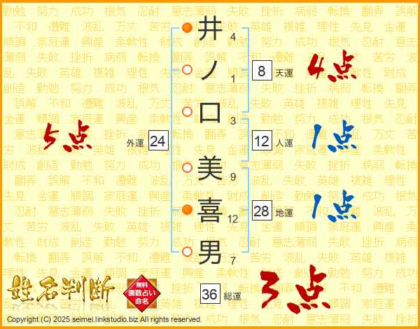 井(4画)ノ(1画)口(3画) 美(9画)喜(12画)男(7画)