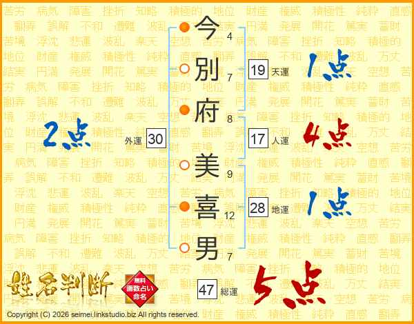 今(4画)別(7画)府(8画) 美(9画)喜(12画)男(7画)