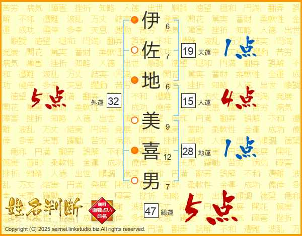 伊(6画)佐(7画)地(6画) 美(9画)喜(12画)男(7画)