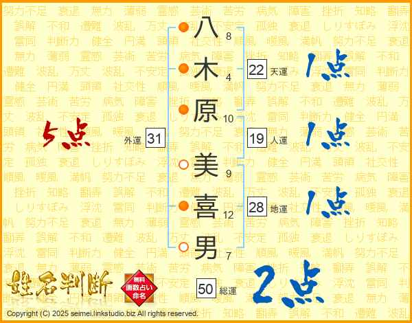 八(8画)木(4画)原(10画) 美(9画)喜(12画)男(7画)