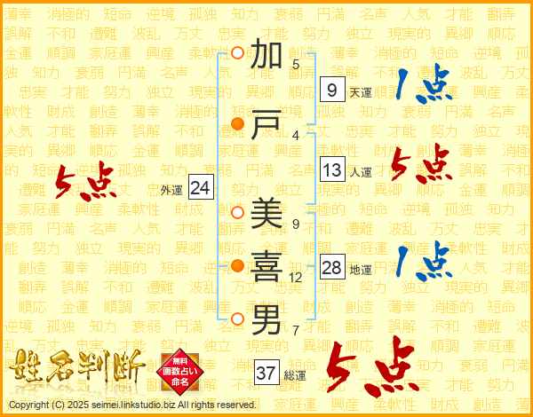 加(5画)戸(4画) 美(9画)喜(12画)男(7画)