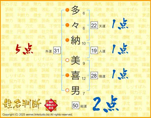 多(6画)々(6画)納(10画) 美(9画)喜(12画)男(7画)