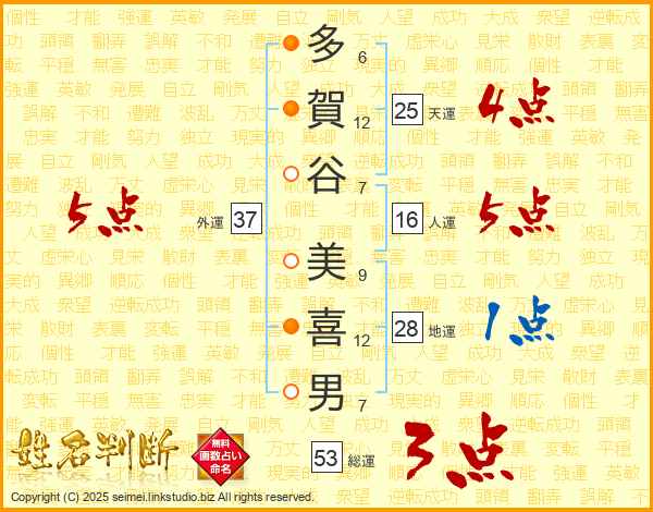 多(6画)賀(12画)谷(7画) 美(9画)喜(12画)男(7画)