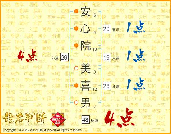 安(6画)心(4画)院(10画) 美(9画)喜(12画)男(7画)