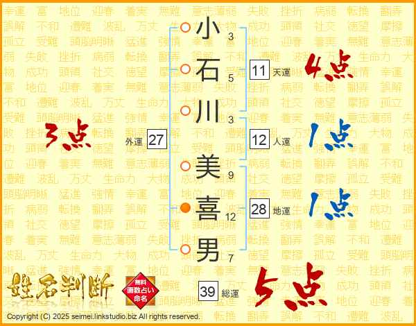小(3画)石(5画)川(3画) 美(9画)喜(12画)男(7画)