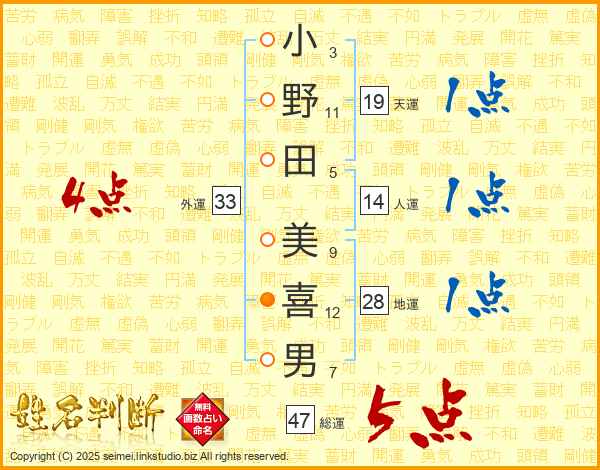 小(3画)野(11画)田(5画) 美(9画)喜(12画)男(7画)