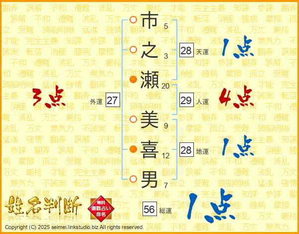 市(5画)之(3画)瀬(20画) 美(9画)喜(12画)男(7画)