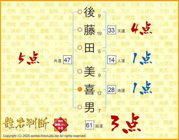 後(9画)藤(19画)田(5画) 美(9画)喜(12画)男(7画)
