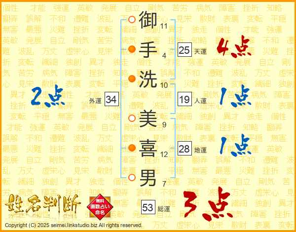 御手洗美喜男さんの総運は53画の3点!