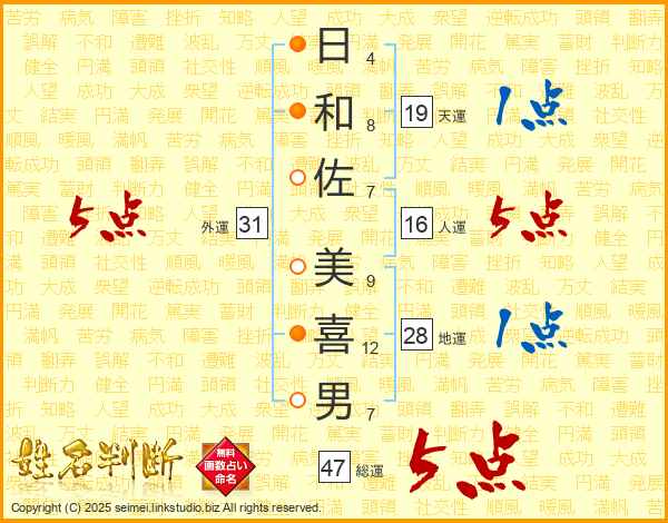 日(4画)和(8画)佐(7画) 美(9画)喜(12画)男(7画)