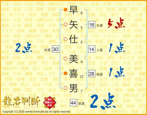 早(6画)矢(5画)仕(5画) 美(9画)喜(12画)男(7画)