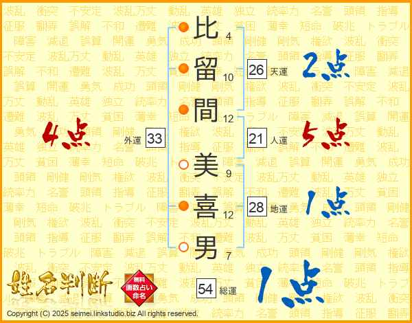 比(4画)留(10画)間(12画) 美(9画)喜(12画)男(7画)