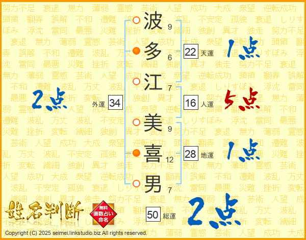 波(9画)多(6画)江(7画) 美(9画)喜(12画)男(7画)