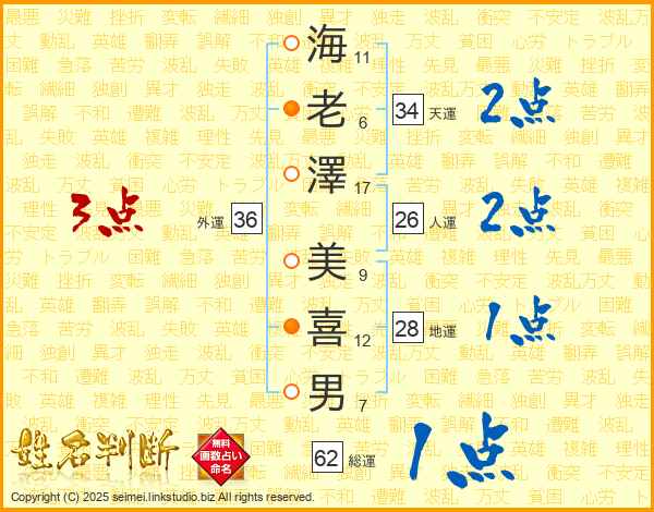 海(11画)老(6画)澤(17画) 美(9画)喜(12画)男(7画)