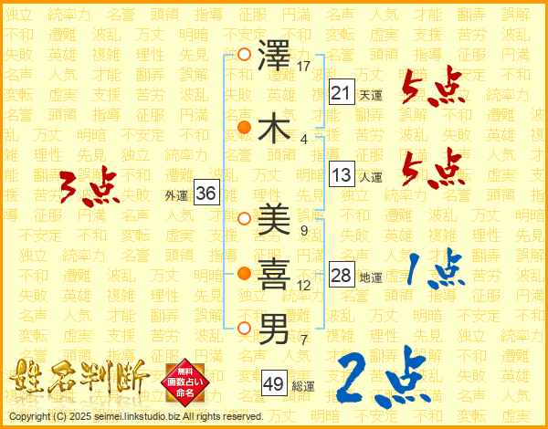 澤(17画)木(4画) 美(9画)喜(12画)男(7画)