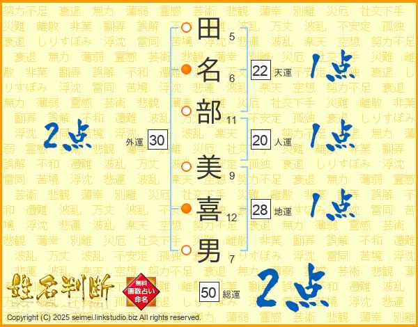 田(5画)名(6画)部(11画) 美(9画)喜(12画)男(7画)