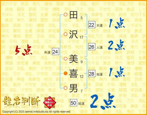田(5画)沢(17画) 美(9画)喜(12画)男(7画)