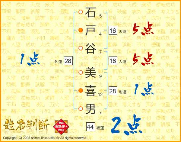 石(5画)戸(4画)谷(7画) 美(9画)喜(12画)男(7画)