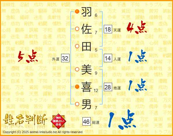 羽(6画)佐(7画)田(5画) 美(9画)喜(12画)男(7画)