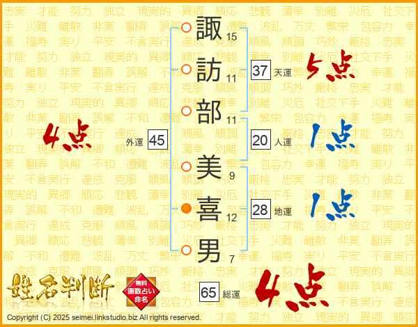 諏(15画)訪(11画)部(11画) 美(9画)喜(12画)男(7画)