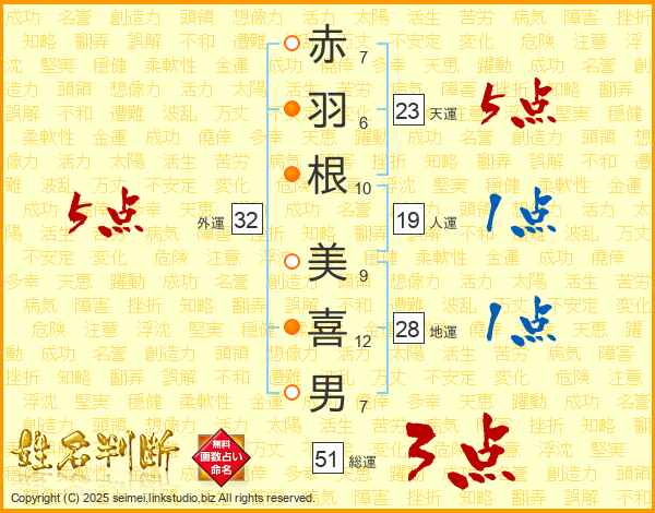 赤(7画)羽(6画)根(10画) 美(9画)喜(12画)男(7画)