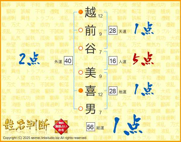 越(12画)前(9画)谷(7画) 美(9画)喜(12画)男(7画)