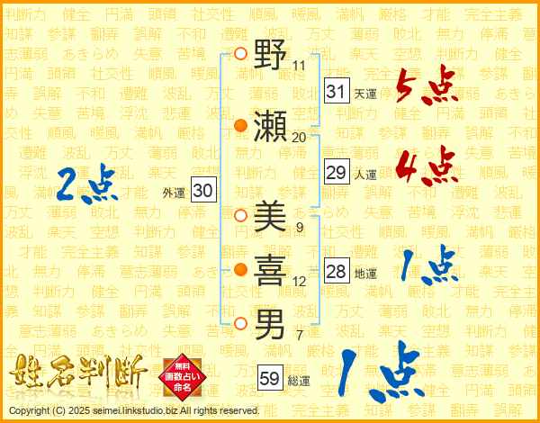 野(11画)瀬(20画) 美(9画)喜(12画)男(7画)