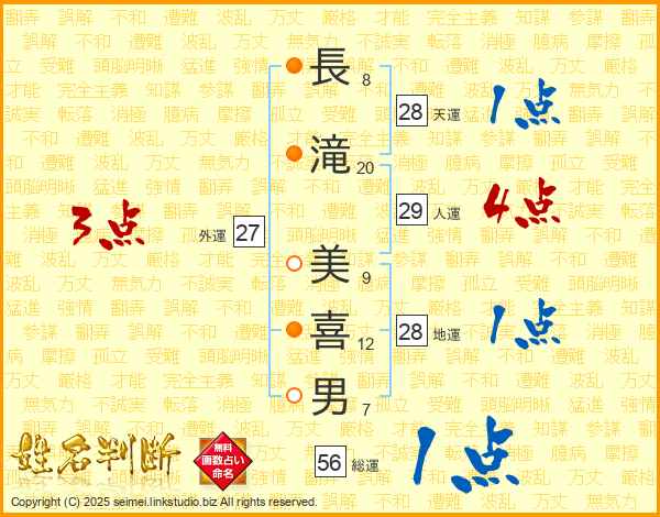 長(8画)滝(20画) 美(9画)喜(12画)男(7画)