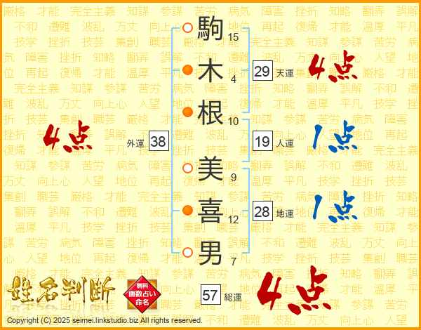 駒(15画)木(4画)根(10画) 美(9画)喜(12画)男(7画)