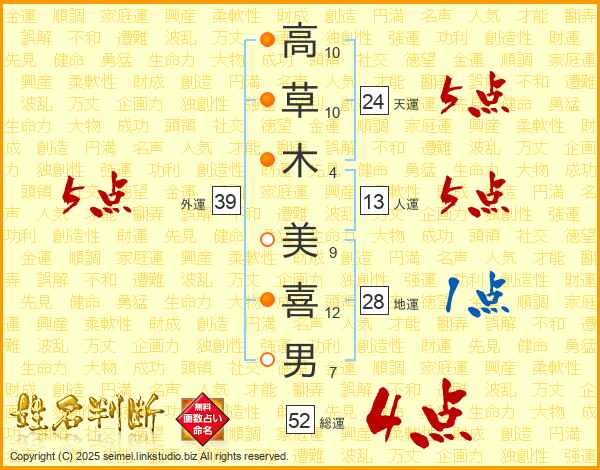 高(10画)草(10画)木(4画) 美(9画)喜(12画)男(7画)